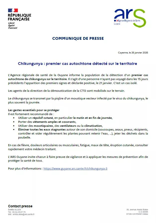 L’Agence régionale de santé de la Guyane informe la population de la détection d’un premier cas autochtone de chikungunya sur le territoire. Il s’agit d’une personne n’ayant pas voyagé dans les 15 jours précédents l’apparition des premiers signes et déclarée positive, le 21 janvier. C’est un cas isolé.